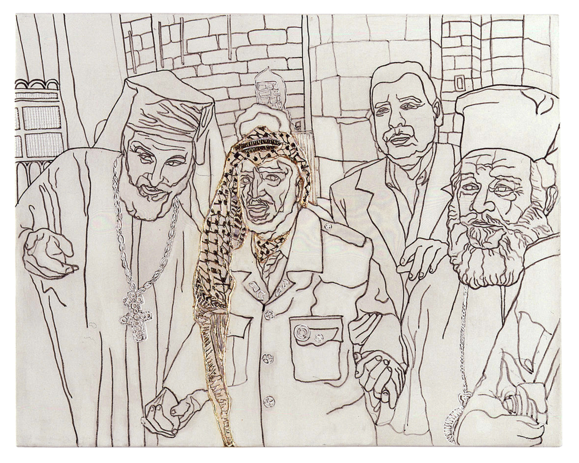 Mideast Conflict , 2003 , indian ink, engraving and gilding on gesso on wooden panel , 9,2 x 11,7 inches