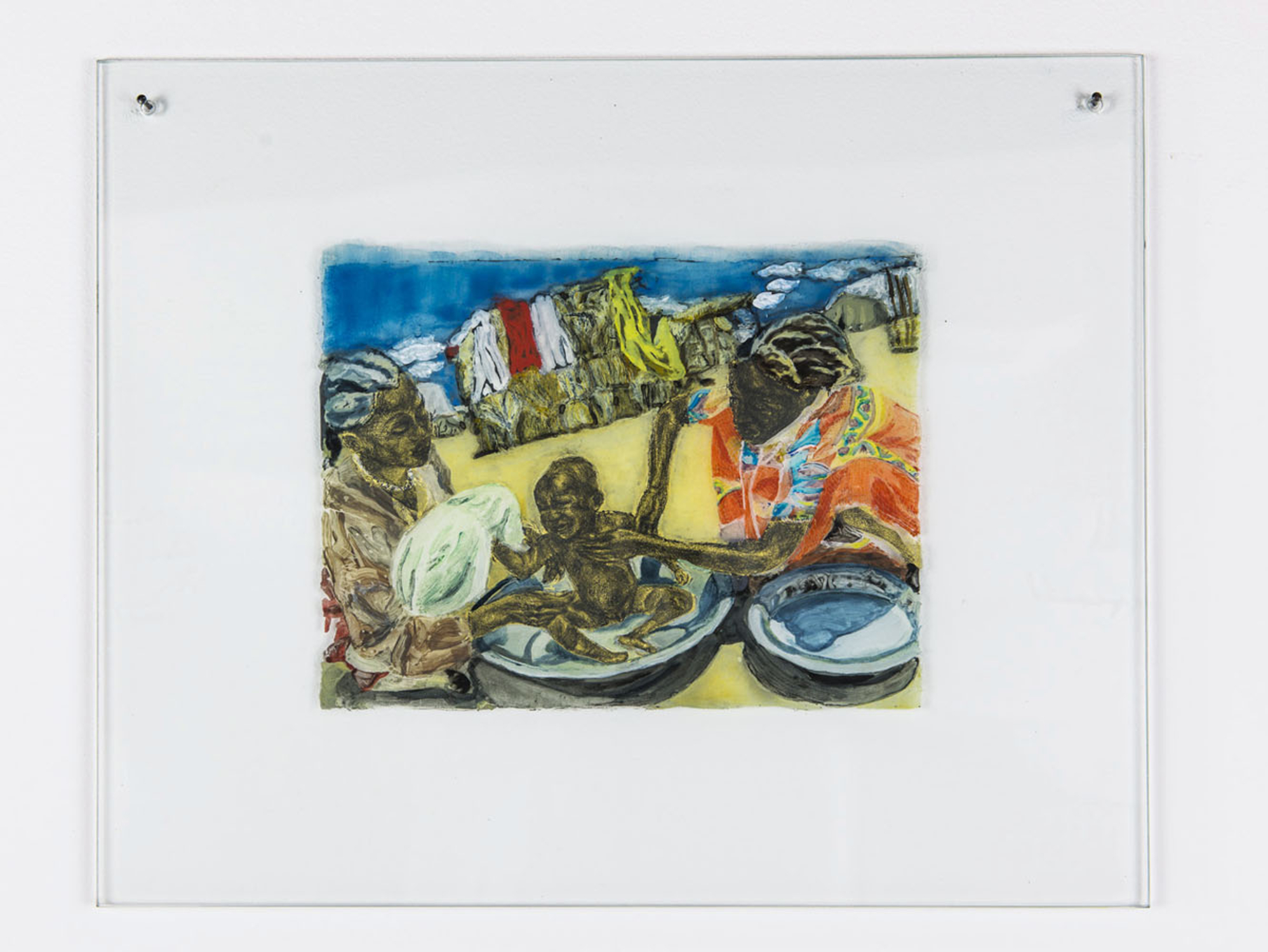 Tusche, Tempera, Ölfarbe, Blattgold hinter Glas