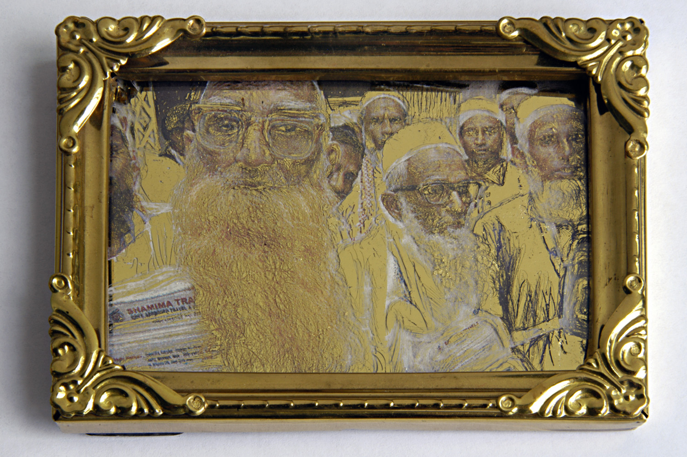 „Something missing?“,2006,Vergoldung auf Glas, radiert, Zeitung, Fotorahmen,10 x 14 cm