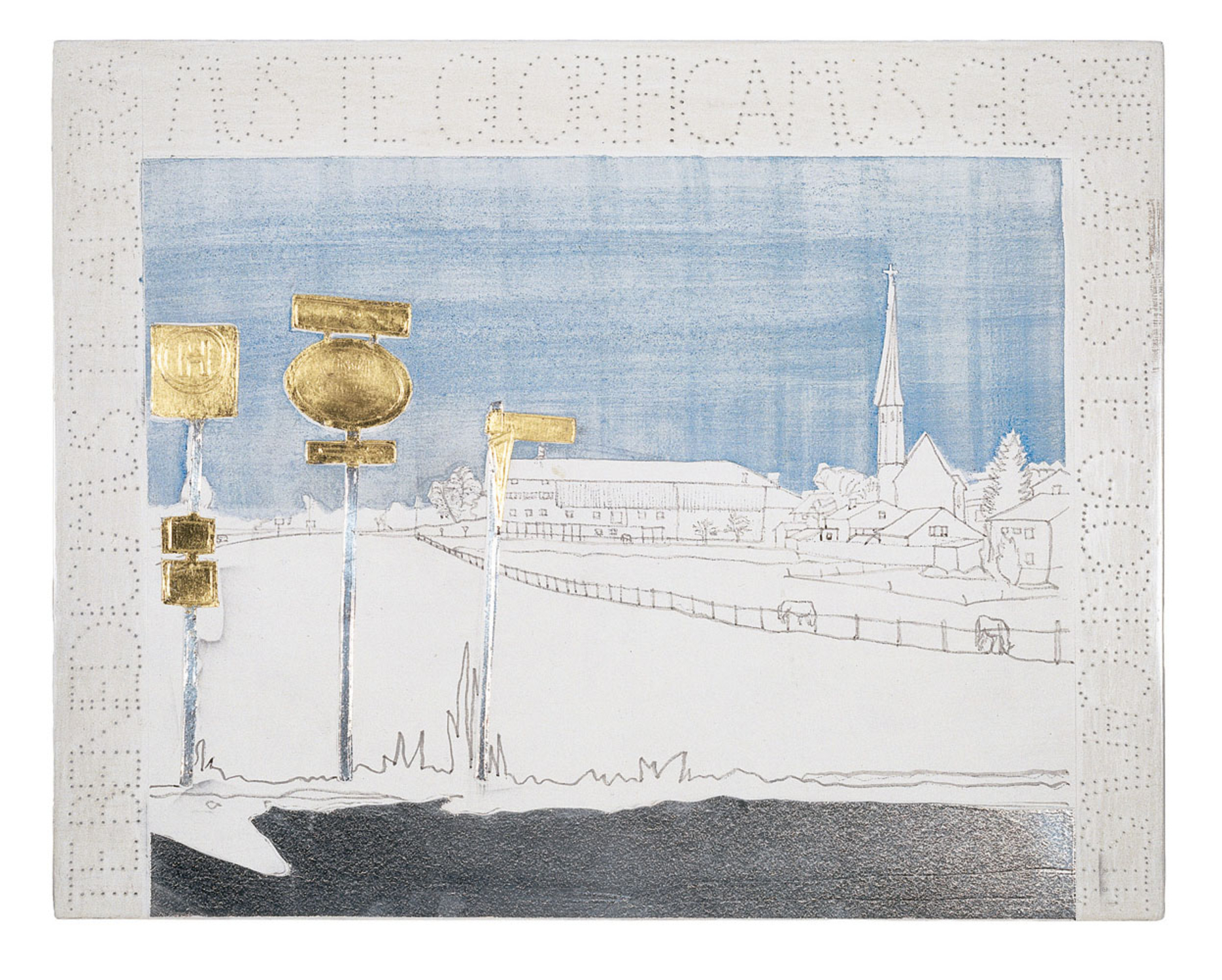 Ostermünchen 1996 , 2002 , Tusche, Gravur und Punzierung, Tempera, Zinnfolie, Blattgold auf Kreidegrund auf Holz , 29,6 cm x 23,4 cm