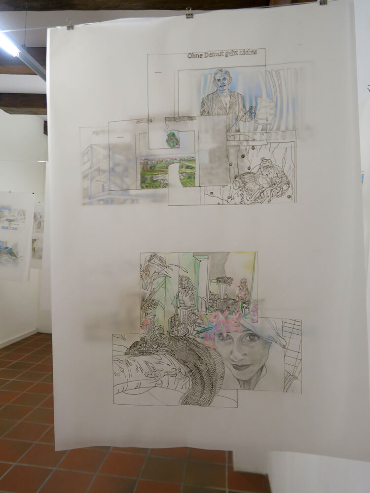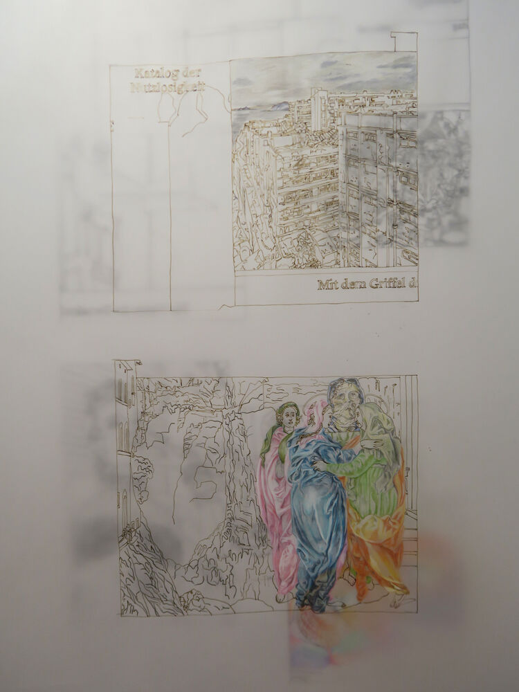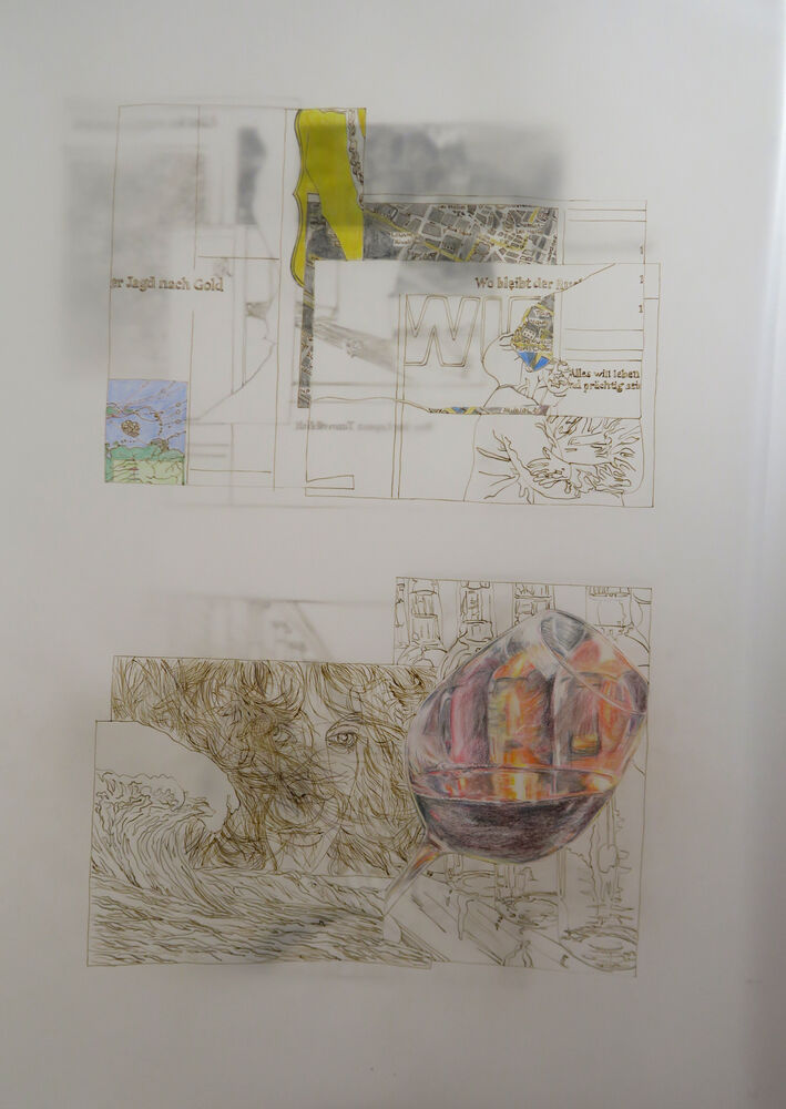 The Collages tell stories of our everyday life. In the drawings of the tracing paper series they are translated and continued.