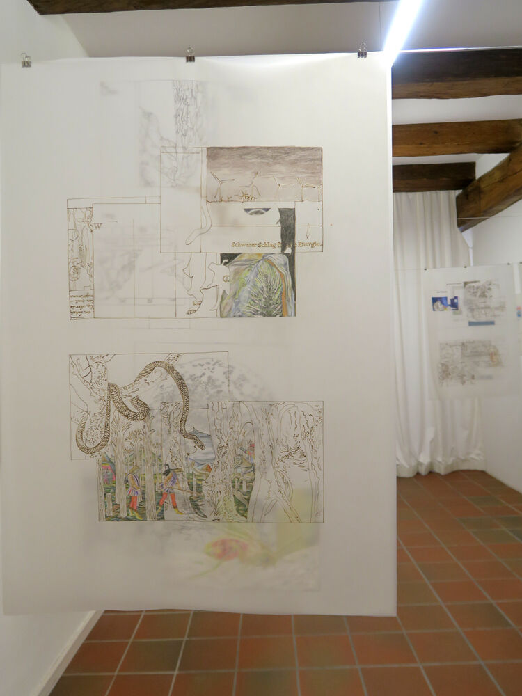 The works of Kathrina Rudolph consist of forty Collages and corresponding with it forty drawings of ink and colourpencil on large sheets of tracing paper
