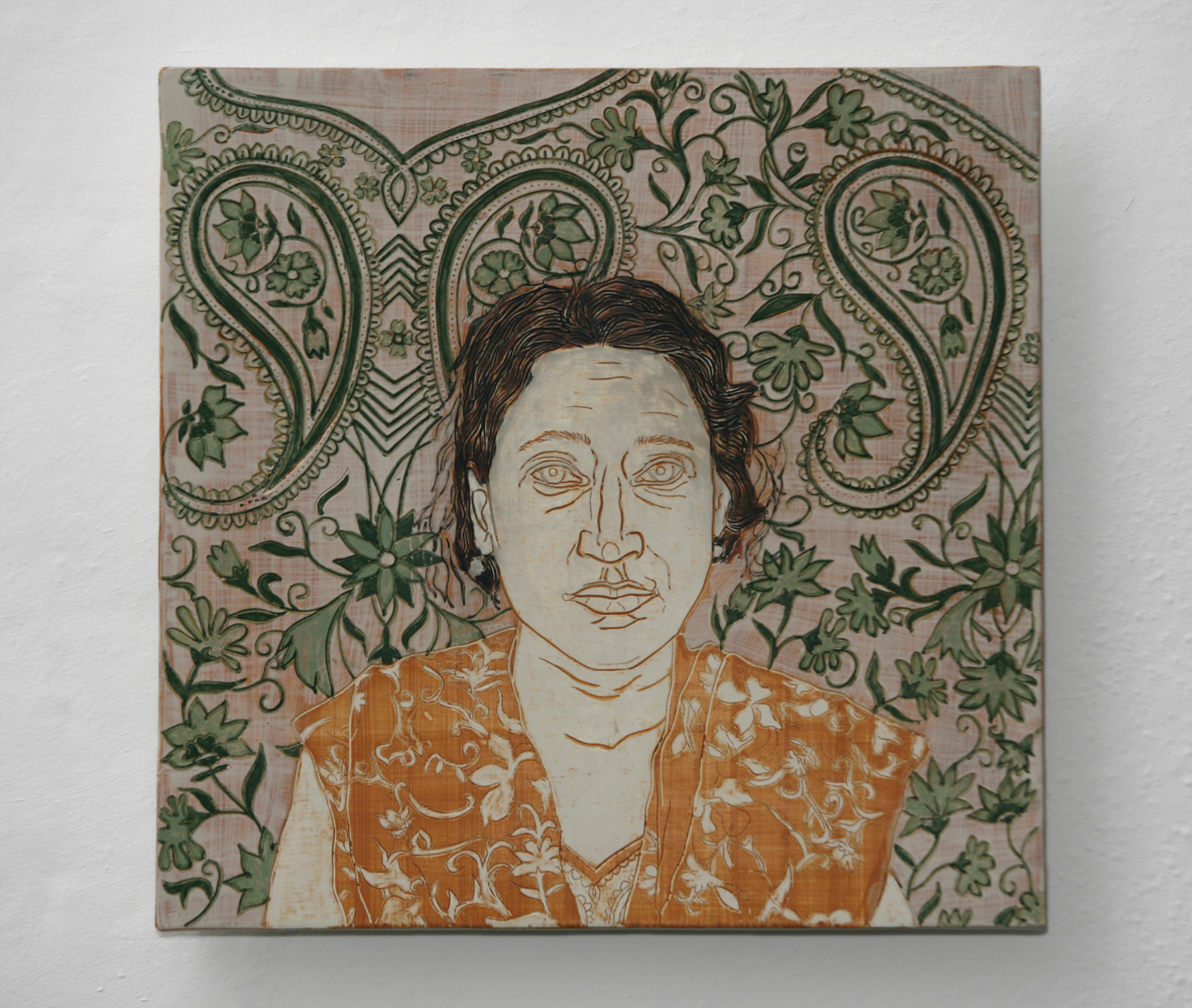 Frauen aus Bangladesch I , 2007 , Gravur und Polimentfarben auf Kreidegrund auf Holz , 33 cm x 33,7 cm